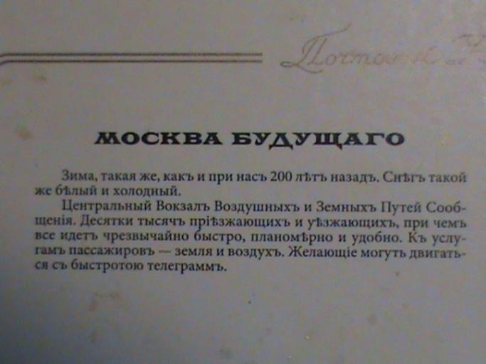 | Keywords: Moscow in XXIII Century. Central Air Vokzal. 1914 B.jpg Moscow in XXIII Century Central Air and Land Vokzal Russian Empire postcard Einem Factory 1914 Moscow Side B Почтовая ка точка из се ии осква в 23 веке шоколадной фи мы Эйнем 1914 года - Цент альный Вокзал Земных и Воздушных Путей Сообщения Об атная сто она Текст «Зима такая же как и п и нас 200 лет назад Снег такой же белый и холодный Цент альный Вокзал Земных и Воздушных Путей Сообщения Десятки тысяч п иезжающих и уезжающих все идет ч езвычайно быст о планоме но и удобно К услугам пассажи ов земля и воздух Желающие могут двигаться с быст отою телег амм» A reproduction of the postcard dated early 20th century photo / Реп одукция почтовой ка точки 1914 года фото бумажной ве сии 1914 unknown and is not indicated on the postcard / на отк ытке не указан PD-old PD-RusEmpire Moscow in XXIII Century fiction |