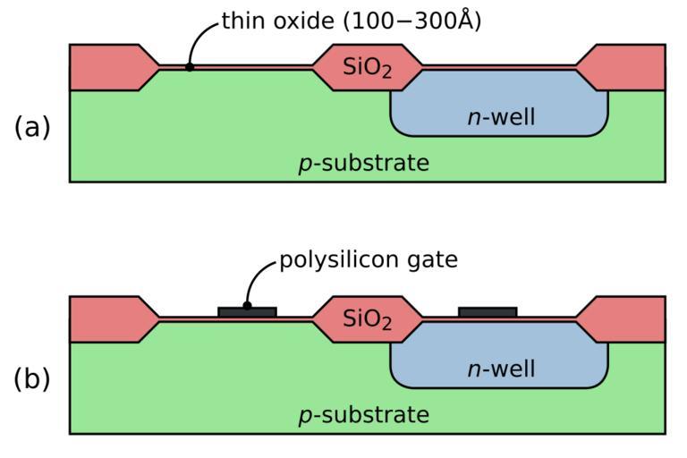 | Keywords: MOSFET Manufacture - 3 - polysilicon gate.svg  Complementary metal oxide-semiconductor CMOS manufacture process A cross-section of the manufacture of a CMOS inverter <br> Stage 3 Polysilicon gate own 2009-11-16 Inductiveload Own work all rights released Public domain CMOS manufacture |
