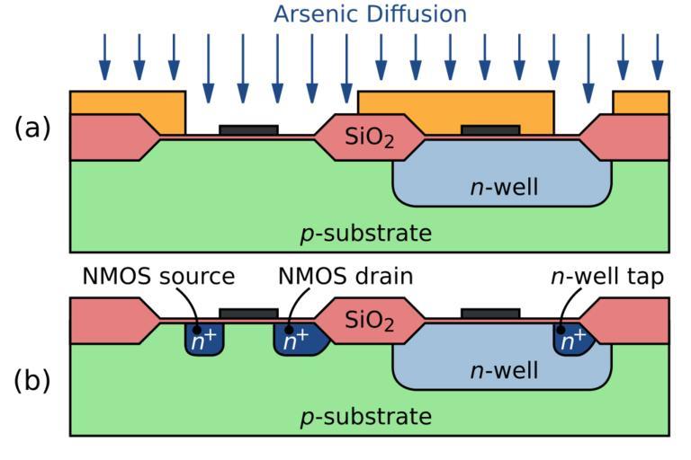 | Keywords: MOSFET Manufacture - 4 - n+ diffusion.svg  Complementary metal oxide-semiconductor CMOS manufacture process A cross-section of the manufacture of a CMOS inverter <br> Stage 4 n+ diffusion own 2009-11-16 Inductiveload Own work all rights released Public domain CMOS manufacture |
