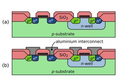 | Keywords: MOSFET Manufacture - 7 - metalisation.svg Complementary metal oxide-semiconductor CMOS manufacture process A cross-section of the manufacture of a CMOS inverter <br> Stage 7 Metalisation own 2009-11-16 Inductiveload Own work all rights released Public domain CMOS manufacture |