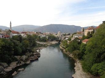 Keywords: mostar bosnia herzegovina stone bridge tower mountains landscape view nature the old town architecture holidays a view of the mountains river bridge tourism travel