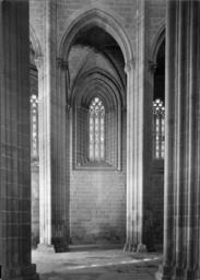 | Keywords: arquitectura gótico portugal batalha mosteiro santa vitória fundação calouste gulbenkian fundaçãocaloustegulbenkian maria pia mariapia brick archway brickarchway cathedral architechture cathedralarchitechture mário tavares chicó máriotavareschicó mário novais márionovais gótica biblioteca de arte bibliotecadearte Interior da Igreja. Fotógrafo: Mário Novais, 1899-1967. Orientador científico: Mário Tavares Chicó, 1905-1966. Data aproximada da produção da fotografia original: 1954. O Mosteiro da Batalha é o mais importante símbolo da Dinastia de Avis. Ele foi construído por iniciativa de D. João I, na sequência de um voto à Virgem, caso vencesse a Batalha de Aljubarrota (1385). Ao longo do século XV, praticamente todos os monarcas aqui deixaram a sua marca. O arranque das obras deu-se em 1388 e foi conduzido por Afonso Domingues, que se manteve à frente do estaleiro até 1402, ano em que faleceu. A ele se atribui o plano geral da construção e o grande avanço dos trabalhos na igreja e no claustro. Não terá tido tempo de executar a fachada principal nem o abobadamento do templo, deixando igualmente inacabado o claustro. A magnífica igreja de três naves e transepto saliente por si delineada, com cabeceira de cinco capelas, sendo a central de duplo tramo e terminação poligonal, terá sido o ponto alto da sua carreira, mas revela bem o nível ainda algo arcaizante da arquitectura portuguesa de finais do século XIV, alheia aos progressos do Gótico Flamejante, que tanto iria marcar a segunda fase do monumento. Com efeito, a partir de 1402, a chefia do estaleiro foi entregue a Huguet, arquitecto de provável origem catalã que inaugurou, entre nós, o tardo-gótico. Documentado à frente do projecto até 1438, a ele se deve o abobadamento dos espaços da igreja e da Sala do Capítulo (onde experimentou, pela primeira vez, uma abóbada estrelada), a construção da Capela do Fundador e, ainda, o início das obras das Capelas Imperfeitas, bem como a conclusão da fachada principal, onde sobressai o portal axial. Este, é delimitado por um arco canopial que integra os escudos de D. João I e de D. Filipa. No tímpano, exibe-se Cristo em Majestade ladeado pelos Evangelistas e as arquivoltas são repletas de figurações que continuam pelas estátuas-colunas, ao abrigo de um complexo programa iconográfico. Mas a mais emblemática obra de Huguet é a Capela do Fundador. Ela foi concebida para panteão régio e sabemos que já se encontrava em obras em 1426. É um compartimento quadrangular que se adossa aos três tramos ocidentais da fachada lateral Sul e integra, ao centro, um esquema octogonal de suportes onde descarrega a abóbada estrelada, solução primeiro experimentada em Inglaterra, mas rapidamente difundida pela Europa. No circuito interior desta capela, colocou-se o túmulo duplo de D. João I e de D. Filipa, realização igualmente sem antecedentes no nosso país e que resulta de uma nítida influência da tumulária inglesa. Na capela repousam também os filhos do casal régio (como D. Henrique e o regente D. Pedro), de acordo com a decisão testamentária de D. João I em fazer deste espaço um efectivo panteão. Em 1436, D. Duarte decidiu edificar uma capela funerária para si próprio. O projecto então concebido por Huguet foi o mais arrojado da sua carreira na Batalha, privilegiando uma planta circular que, todavia, não viria a ser concluída pelo falecimento do mestre dois anos depois. Desta forma, e não obstante a intervenção de Mestre Martim Vasques, a construção cessou até ao reinado de D. Manuel e, mesmo nessa altura, não foi concluída, razão de esta parcela ser conhecida como as Capelas Imperfeitas. No reinado de D. Afonso V, edificou-se o segundo claustro do mosteiro. Ele resulta da intervenção do arquitecto Fernão de Évora e, estilisticamente, é uma obra que contraria o tardo-gótico de raiz flamejante, tendo-se optado deliberadamente pela austeridade arquitectónica, que rejeita até a inclusão de capitéis a marcar o arranque dos arcos. A Batalha teve outras fases construtivas igualmente relevantes, como o Manuelino ou o Renascimento. Todavia, a mudança dinástica verificada com D. Manuel privilegiou outros locais e, só no século XIX, o Mosteiro voltou a ser intervencionado, desta vez com o objectivo de restaurar o conjunto, campanha que se prolongou por meio século. (Fonte: IPPAR - tinyurl.com/5dmlfe) [CFT015.163.ic] Interior da Igreja. Fotógrafo: Mário Novais, 1899-1967. Orientador científico: Mário Tavares Chicó, 1905-1966. Data aproximada da produção da fotografia original: 1954. O Mosteiro da Batalha é o mais importante símbolo da Dinastia de Avis. Ele foi construído por iniciativa de D. João I, na sequência de um voto à Virgem, caso vencesse a Batalha de Aljubarrota (1385). Ao longo do século XV, praticamente todos os monarcas aqui deixaram a sua marca. O arranque das obras deu-se em 1388 e foi conduzido por Afonso Domingues, que se manteve à frente do estaleiro até 1402, ano em que faleceu. A ele se atribui o plano geral da construção e o grande avanço dos trabalhos na igreja e no claustro. Não terá tido tempo de executar a fachada principal nem o abobadamento do templo, deixando igualmente inacabado o claustro. A magnífica igreja de três naves e transepto saliente por si delineada, com cabeceira de cinco capelas, sendo a central de duplo tramo e terminação poligonal, terá sido o ponto alto da sua carreira, mas revela bem o nível ainda algo arcaizante da arquitectura portuguesa de finais do século XIV, alheia aos progressos do Gótico Flamejante, que tanto iria marcar a segunda fase do monumento. Com efeito, a partir de 1402, a chefia do estaleiro foi entregue a Huguet, arquitecto de provável origem catalã que inaugurou, entre nós, o tardo-gótico. Documentado à frente do projecto até 1438, a ele se deve o abobadamento dos espaços da igreja e da Sala do Capítulo (o