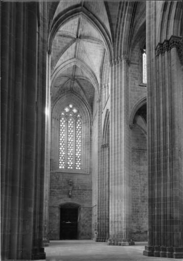 | Keywords: arquitectura gótico portugal batalha mosteiro santa vitória fundação calouste gulbenkian fundaçãocaloustegulbenkian maria pia mariapia mário tavares chicó máriotavareschicó mário novais márionovais gótica biblioteca de arte bibliotecadearte Interior da Igreja. Fotógrafo: Mário Novais, 1899-1967. Orientador científico: Mário Tavares Chicó, 1905-1966. Data aproximada da produção da fotografia original: 1954. O Mosteiro da Batalha é o mais importante símbolo da Dinastia de Avis. Ele foi construído por iniciativa de D. João I, na sequência de um voto à Virgem, caso vencesse a Batalha de Aljubarrota (1385). Ao longo do século XV, praticamente todos os monarcas aqui deixaram a sua marca. O arranque das obras deu-se em 1388 e foi conduzido por Afonso Domingues, que se manteve à frente do estaleiro até 1402, ano em que faleceu. A ele se atribui o plano geral da construção e o grande avanço dos trabalhos na igreja e no claustro. Não terá tido tempo de executar a fachada principal nem o abobadamento do templo, deixando igualmente inacabado o claustro. A magnífica igreja de três naves e transepto saliente por si delineada, com cabeceira de cinco capelas, sendo a central de duplo tramo e terminação poligonal, terá sido o ponto alto da sua carreira, mas revela bem o nível ainda algo arcaizante da arquitectura portuguesa de finais do século XIV, alheia aos progressos do Gótico Flamejante, que tanto iria marcar a segunda fase do monumento. Com efeito, a partir de 1402, a chefia do estaleiro foi entregue a Huguet, arquitecto de provável origem catalã que inaugurou, entre nós, o tardo-gótico. Documentado à frente do projecto até 1438, a ele se deve o abobadamento dos espaços da igreja e da Sala do Capítulo (onde experimentou, pela primeira vez, uma abóbada estrelada), a construção da Capela do Fundador e, ainda, o início das obras das Capelas Imperfeitas, bem como a conclusão da fachada principal, onde sobressai o portal axial. Este, é delimitado por um arco canopial que integra os escudos de D. João I e de D. Filipa. No tímpano, exibe-se Cristo em Majestade ladeado pelos Evangelistas e as arquivoltas são repletas de figurações que continuam pelas estátuas-colunas, ao abrigo de um complexo programa iconográfico. Mas a mais emblemática obra de Huguet é a Capela do Fundador. Ela foi concebida para panteão régio e sabemos que já se encontrava em obras em 1426. É um compartimento quadrangular que se adossa aos três tramos ocidentais da fachada lateral Sul e integra, ao centro, um esquema octogonal de suportes onde descarrega a abóbada estrelada, solução primeiro experimentada em Inglaterra, mas rapidamente difundida pela Europa. No circuito interior desta capela, colocou-se o túmulo duplo de D. João I e de D. Filipa, realização igualmente sem antecedentes no nosso país e que resulta de uma nítida influência da tumulária inglesa. Na capela repousam também os filhos do casal régio (como D. Henrique e o regente D. Pedro), de acordo com a decisão testamentária de D. João I em fazer deste espaço um efectivo panteão. Em 1436, D. Duarte decidiu edificar uma capela funerária para si próprio. O projecto então concebido por Huguet foi o mais arrojado da sua carreira na Batalha, privilegiando uma planta circular que, todavia, não viria a ser concluída pelo falecimento do mestre dois anos depois. Desta forma, e não obstante a intervenção de Mestre Martim Vasques, a construção cessou até ao reinado de D. Manuel e, mesmo nessa altura, não foi concluída, razão de esta parcela ser conhecida como as Capelas Imperfeitas. No reinado de D. Afonso V, edificou-se o segundo claustro do mosteiro. Ele resulta da intervenção do arquitecto Fernão de Évora e, estilisticamente, é uma obra que contraria o tardo-gótico de raiz flamejante, tendo-se optado deliberadamente pela austeridade arquitectónica, que rejeita até a inclusão de capitéis a marcar o arranque dos arcos. A Batalha teve outras fases construtivas igualmente relevantes, como o Manuelino ou o Renascimento. Todavia, a mudança dinástica verificada com D. Manuel privilegiou outros locais e, só no século XIX, o Mosteiro voltou a ser intervencionado, desta vez com o objectivo de restaurar o conjunto, campanha que se prolongou por meio século. (Fonte: IPPAR - tinyurl.com/5dmlfe) [CFT015.165.ic] Interior da Igreja. Fotógrafo: Mário Novais, 1899-1967. Orientador científico: Mário Tavares Chicó, 1905-1966. Data aproximada da produção da fotografia original: 1954. O Mosteiro da Batalha é o mais importante símbolo da Dinastia de Avis. Ele foi construído por iniciativa de D. João I, na sequência de um voto à Virgem, caso vencesse a Batalha de Aljubarrota (1385). Ao longo do século XV, praticamente todos os monarcas aqui deixaram a sua marca. O arranque das obras deu-se em 1388 e foi conduzido por Afonso Domingues, que se manteve à frente do estaleiro até 1402, ano em que faleceu. A ele se atribui o plano geral da construção e o grande avanço dos trabalhos na igreja e no claustro. Não terá tido tempo de executar a fachada principal nem o abobadamento do templo, deixando igualmente inacabado o claustro. A magnífica igreja de três naves e transepto saliente por si delineada, com cabeceira de cinco capelas, sendo a central de duplo tramo e terminação poligonal, terá sido o ponto alto da sua carreira, mas revela bem o nível ainda algo arcaizante da arquitectura portuguesa de finais do século XIV, alheia aos progressos do Gótico Flamejante, que tanto iria marcar a segunda fase do monumento. Com efeito, a partir de 1402, a chefia do estaleiro foi entregue a Huguet, arquitecto de provável origem catalã que inaugurou, entre nós, o tardo-gótico. Documentado à frente do projecto até 1438, a ele se deve o abobadamento dos espaços da igreja e da Sala do Capítulo (onde experimentou, pela primeira vez, uma abóbada estrelada), a construç