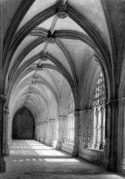 | Keywords: arquitectura gótico portugal batalha mosteiro santa vitória fundação calouste gulbenkian fundaçãocaloustegulbenkian maria pia mariapia mário tavares chicó máriotavareschicó mário novais márionovais gótica biblioteca de arte bibliotecadearte Claustro real: galeria com abóbada. Fotógrafo: Mário Novais, 1899-1967. Orientador científico: Mário Tavares Chicó, 1905-1966. Data aproximada da produção da fotografia original: 1954. O Mosteiro da Batalha é o mais importante símbolo da Dinastia de Avis. Ele foi construído por iniciativa de D. João I, na sequência de um voto à Virgem, caso vencesse a Batalha de Aljubarrota (1385). Ao longo do século XV, praticamente todos os monarcas aqui deixaram a sua marca. O arranque das obras deu-se em 1388 e foi conduzido por Afonso Domingues, que se manteve à frente do estaleiro até 1402, ano em que faleceu. A ele se atribui o plano geral da construção e o grande avanço dos trabalhos na igreja e no claustro. Não terá tido tempo de executar a fachada principal nem o abobadamento do templo, deixando igualmente inacabado o claustro. A magnífica igreja de três naves e transepto saliente por si delineada, com cabeceira de cinco capelas, sendo a central de duplo tramo e terminação poligonal, terá sido o ponto alto da sua carreira, mas revela bem o nível ainda algo arcaizante da arquitectura portuguesa de finais do século XIV, alheia aos progressos do Gótico Flamejante, que tanto iria marcar a segunda fase do monumento. Com efeito, a partir de 1402, a chefia do estaleiro foi entregue a Huguet, arquitecto de provável origem catalã que inaugurou, entre nós, o tardo-gótico. Documentado à frente do projecto até 1438, a ele se deve o abobadamento dos espaços da igreja e da Sala do Capítulo (onde experimentou, pela primeira vez, uma abóbada estrelada), a construção da Capela do Fundador e, ainda, o início das obras das Capelas Imperfeitas, bem como a conclusão da fachada principal, onde sobressai o portal axial. Este, é delimitado por um arco canopial que integra os escudos de D. João I e de D. Filipa. No tímpano, exibe-se Cristo em Majestade ladeado pelos Evangelistas e as arquivoltas são repletas de figurações que continuam pelas estátuas-colunas, ao abrigo de um complexo programa iconográfico. Mas a mais emblemática obra de Huguet é a Capela do Fundador. Ela foi concebida para panteão régio e sabemos que já se encontrava em obras em 1426. É um compartimento quadrangular que se adossa aos três tramos ocidentais da fachada lateral Sul e integra, ao centro, um esquema octogonal de suportes onde descarrega a abóbada estrelada, solução primeiro experimentada em Inglaterra, mas rapidamente difundida pela Europa. No circuito interior desta capela, colocou-se o túmulo duplo de D. João I e de D. Filipa, realização igualmente sem antecedentes no nosso país e que resulta de uma nítida influência da tumulária inglesa. Na capela repousam também os filhos do casal régio (como D. Henrique e o regente D. Pedro), de acordo com a decisão testamentária de D. João I em fazer deste espaço um efectivo panteão. Em 1436, D. Duarte decidiu edificar uma capela funerária para si próprio. O projecto então concebido por Huguet foi o mais arrojado da sua carreira na Batalha, privilegiando uma planta circular que, todavia, não viria a ser concluída pelo falecimento do mestre dois anos depois. Desta forma, e não obstante a intervenção de Mestre Martim Vasques, a construção cessou até ao reinado de D. Manuel e, mesmo nessa altura, não foi concluída, razão de esta parcela ser conhecida como as Capelas Imperfeitas. No reinado de D. Afonso V, edificou-se o segundo claustro do mosteiro. Ele resulta da intervenção do arquitecto Fernão de Évora e, estilisticamente, é uma obra que contraria o tardo-gótico de raiz flamejante, tendo-se optado deliberadamente pela austeridade arquitectónica, que rejeita até a inclusão de capitéis a marcar o arranque dos arcos. A Batalha teve outras fases construtivas igualmente relevantes, como o Manuelino ou o Renascimento. Todavia, a mudança dinástica verificada com D. Manuel privilegiou outros locais e, só no século XIX, o Mosteiro voltou a ser intervencionado, desta vez com o objectivo de restaurar o conjunto, campanha que se prolongou por meio século. (Fonte: IPPAR - tinyurl.com/5dmlfe) [CFT015.181.ic] Claustro real: galeria com abóbada. Fotógrafo: Mário Novais, 1899-1967. Orientador científico: Mário Tavares Chicó, 1905-1966. Data aproximada da produção da fotografia original: 1954. O Mosteiro da Batalha é o mais importante símbolo da Dinastia de Avis. Ele foi construído por iniciativa de D. João I, na sequência de um voto à Virgem, caso vencesse a Batalha de Aljubarrota (1385). Ao longo do século XV, praticamente todos os monarcas aqui deixaram a sua marca. O arranque das obras deu-se em 1388 e foi conduzido por Afonso Domingues, que se manteve à frente do estaleiro até 1402, ano em que faleceu. A ele se atribui o plano geral da construção e o grande avanço dos trabalhos na igreja e no claustro. Não terá tido tempo de executar a fachada principal nem o abobadamento do templo, deixando igualmente inacabado o claustro. A magnífica igreja de três naves e transepto saliente por si delineada, com cabeceira de cinco capelas, sendo a central de duplo tramo e terminação poligonal, terá sido o ponto alto da sua carreira, mas revela bem o nível ainda algo arcaizante da arquitectura portuguesa de finais do século XIV, alheia aos progressos do Gótico Flamejante, que tanto iria marcar a segunda fase do monumento. Com efeito, a partir de 1402, a chefia do estaleiro foi entregue a Huguet, arquitecto de provável origem catalã que inaugurou, entre nós, o tardo-gótico. Documentado à frente do projecto até 1438, a ele se deve o abobadamento dos espaços da igreja e da Sala do Capítulo (onde experimentou, pela primeira vez, uma