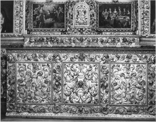 | Keywords: talha portugal mosteiro são martinho tibães capela robert smith fundação calouste gulbenkian fundaçãocaloustegulbenkian monastery altar chapel black and white blackandwhite braga biblioteca de arte bibliotecadearte black and white Capela lateral do lado do Evangelho: frontal do altar. Talha dos séculos 17-18. Fotógrafo: Robert Chester Smith (1912-1975). Data de produção da fotografia original: 1962-1964. [CFT008.0228.ic] Capela lateral do lado do Evangelho: frontal do altar. Talha dos séculos 17-18. Fotógrafo: Robert Chester Smith (1912-1975). Data de produção da fotografia original: 1962-1964. [CFT008.0228.ic] |
