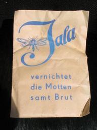 | Keywords: Moth paper-bag Jala Chemische Werke Königgrätz 1.jpg Moth paper-bag against damage caused by moth; Germany Jala vernichtet die Motten samt Brut Gebrauchsanweisung Man gibt Jala in offene Kleider- Mantel- oder Pelztasche und haltet den Kleiderschrank geschlossen Chem Werke JAN VLASAK Königgrätz Genehmigt Zi 390 IIIB-036-1 des Amtes für Preisbildung und à berwachung Hamburg 10 3 44 Aus einem Muffkarton siehe hier Die Beutel sind in der Zeit Ende oder nach 2 Weltkrieg beigelegt worden <br /> Darin befand sich außerdem ein im Leder zerfallener nicht durch Motten zerfressener Skunkskaninmuff Kollektion Kuhn Düsseldorf own collection 1943 or later Kürschner <span class signature-talk >talk</span> 08 49 30 May 2010 UTC de German Wikipedia 1 thumb Moth traps Insect repellents Poisons Furrier's collection Kuhn Products of Hradec Králové |