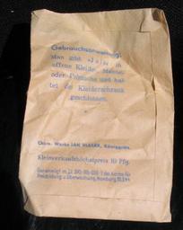 | Keywords: Moth paper-bag Jala Chemische Werke Königgrätz 2.jpg Moth paper-bag against damage caused by moth; Germany Jala vernichtet die Motten samt Brut Gebrauchsanweisung Man gibt Jala in offene Kleider- Mantel- oder Pelztasche und haltet den Kleiderschrank geschlossen Chem Werke JAN VLASAK Königgrätz Genehmigt Zi 390 IIIB-036-1 des Amtes für Preisbildung und à berwachung Hamburg 10 3 44 Aus einem Muffkarton siehe hier Die Beutel sind in der Zeit Ende oder nach 2 Weltkrieg beigelegt worden <br /> Darin befand sich außerdem ein im Leder zerfallener nicht durch Motten zerfressener Skunkskaninmuff Kollektion Kuhn Düsseldorf own collection 1943 or later Kürschner <span class signature-talk >talk</span> 08 56 30 May 2010 UTC de German Wikipedia 1 thumb Moth traps Insect repellents Poisons Furrier's collection Kuhn Products of Hradec Králové History of Hradec Králové |