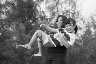 Keywords: mother child daughter smile family fun carrying on arms young generation black and white photography vietnam phú quốc