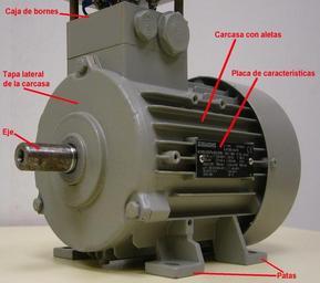 Keywords: Motor asincrono.jpg Fotografía de un motor asíncrono de jaula de ardilla de 0 55 kW 50 Hz 230/400 V y 1400 rpm con indicación de sus elementos más importantes 2006-06-21 own assumed Rodrigma Induction motors
