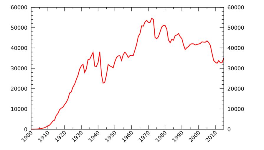 | Keywords: Motor vehicle deaths in the US.svg en Motor vehicle deaths in the US since 1900 de Verkehrstote in den USA seit 1900 <syntaxhighlight lang gnuplot > set terminal svg size 700 400 enhanced font Linux Biolinum 14 set xtics 10 set mxtics 2 set yrange 0 60000 set xrange 1900 2015 set xtics rotate by 45 right set mytics 5 set y2tics unset key set output Motor vehicle deaths in the US svg plot usa dat u 1 2 with lines lc 'red' lw 2 set output set terminal pop </syntaxhighlight> own 2014 “06-22 Kopiersperre usa dat year deaths 1900 36 1901 54 1902 79 1903 117 1904 172 1905 252 1906 338 1907 581 1908 751 1909 1174 1910 1599 1911 2043 1912 2968 1913 4079 1914 4468 1915 6779 1916 7766 1917 9630 1918 10390 1919 10896 1920 12155 1921 13253 1922 14859 1923 17870 1924 18400 1925 20771 1926 22194 1927 24470 1928 26557 1929 29592 1930 31204 1931 31963 1932 27979 1933 29746 1934 34240 1935 34494 1936 36126 1937 37819 1938 31083 1939 30895 1940 32914 1941 38142 1942 27007 1943 22727 1944 23165 1945 26785 1946 31874 1947 31193 1948 30775 1949 30246 1950 33186 1951 35309 1952 36088 1953 36190 1954 33890 1955 36688 1956 37965 1957 36932 1958 35331 1959 36223 1960 36399 1961 36285 1962 38980 1963 41723 1964 45645 1965 47089 1966 50894 1967 50724 1968 52725 1969 53543 1970 52627 1971 52542 1972 54589 1973 54052 1974 45196 1975 44525 1976 45523 1977 47878 1978 50331 1979 51093 1980 51091 1981 49301 1982 43945 1983 42589 1984 44257 1985 43825 1986 46087 1987 46390 1988 47087 1989 45582 1990 44599 1991 41508 1992 39250 1993 40150 1994 40716 1995 41817 1996 42065 1997 42013 1998 41501 1999 41717 2000 41945 2001 42196 2002 43005 2003 42884 2004 42836 2005 43510 2006 42708 2007 41259 2008 37423 2009 33883 2010 32999 2011 32479 2012 33782 2013 32719 2014 32744 2015 35092 Data since 2005 https //crashstats nhtsa dot gov/Api/Public/ViewPublication/812101 Motor Vehicle Traffic Fatalities in 2013 https //crashstats nhtsa dot gov/Api/Public/ViewPublication/812318 Motor Vehicle Traffic Fatalities in 2015 Images with Gnuplot source code Damage by road transport User Kopiersperre Diagrams Statistics of the United States Road transport statistics |