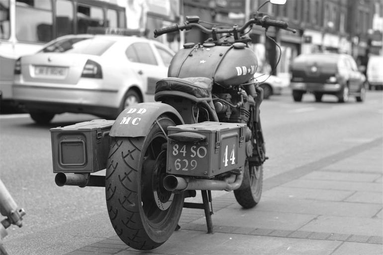 Keywords: motorcycle cars sidewalk street road pavement black and white