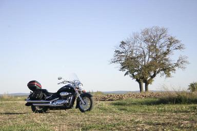 Keywords: motorcycle suzuki intruder black parked field new shiny ride bike motorbike