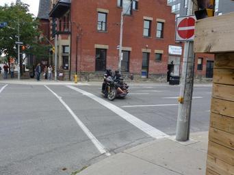 | Keywords: Motorcycle with modified sidecar for filming chase scenes.JPG Motorcycle with modified sidecar for filming chase scenes for the series Covert Affairs Some portion of the show is filmed in Toronto pinch-hitting for Washington DC Some portions seem to be filmed on location in exotic locales while other portions seem to be actually filmed in DC As television productions go Covert Affairs seems to use an unusually large crew Last year a motorcycle adapted to serve as a film dolly was parked outside my neighbourhood deli and I had a chance to take a good look at it But I didn't have my camera with me Interestingly it used a different design than this one I only got off the one shot of this vehicle It mounted an adapted side-car with a crew of two The front guy was sitting with his butt right on the platform holding the camera I don't know what kind of motorcycle this was The motorcycle in last year's vehicle was a big old Harley-Davidson It was mounted in a kind of pipe-frame scaffolding with big castors that was carrying a much bigger camera than this one Maybe the rear guy was the director or director of photography Interestingly both he and the driver are wearing gloves but the photographer isn't Look closely and you can see that the photographer is wearing shorts and what looks like a knee brace on his outside knee It looks like health and safety of photographers is not a high concern own 2013-07- Geo Swan <span class signature-talk >talk</span> 43 39 1 67 N 79 22 6 15 W source exif_heading Adelaide Street Toronto 2013 in Toronto Berkeley Street Toronto Covert Affairs location shooting in Toronto Alumnae Theatre Sidecars in Canada Taken with Panasonic Lumix DMC-ZS10 Photographs by Geo Swan |