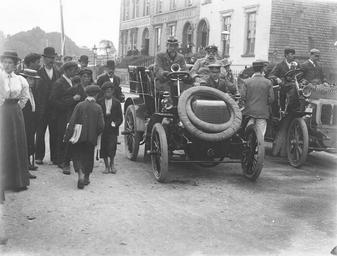 | Keywords: motoring driving motor cars motorcars goff colonel mcgrath colonelmcgrath newsboy poole collection poolecollection glass negative glassnegative a.h. poole ahpoole arthur henri poole arthurhenripoole adelphi hotel adelphihotel waterford steamship office waterfordsteamshipoffice steamship office steamshipoffice the mall themall ireland munster william g.d. goff williamgdgoff great 1,000 mile irish tour great1000mileirishtour irish automobile club irishautomobileclub royal irish automobile club royalirishautomobileclub r.i.a.c. riac daimler wi 1 wi1 r.j. mecredy rjmecredy father of motoring in ireland fatherofmotoringinireland august 1901 1900s sir william goff davis-goff sirwilliamgoffdavisgoff arjay friday 9 chauffeur milne waterford national library of ireland nationallibraryofireland blackandwhite monochrome outdoor black and white Mr Goff (bearded) driving with Colonel McGrath on The Mall in Waterford. This was the bare bones of information we originally had on this photo... However, thanks to Bob Montgomery 2012 for his fantastic contribution that this photo was taken: "... on the Great 1,000 mile Irish Tour organized by the Irish Automobile Club (now the Royal Irish Automobile Club at Dawson Street, Dublin). The bearded gentlemen in the middle is Waterford businessman, motoring pioneer and Chairman of the Irish Automobile Club, William GD Goff on his Daimler motor car. Seated beside him with the wonderful facial hair is Col. McGrath, the first motorist in Wexford. To their right is RJ Mecredy (The Father of Motoring in Ireland). Mecredy and Goff were responsible for bring the Motor Tour to Ireland in 1901." Date: Friday, 9 August 1901 NLI Ref.: P_WP_0344 Mr Goff (bearded) driving with Colonel McGrath on The Mall in Waterford. This was the bare bones of information we originally had on this photo... However, thanks to Bob Montgomery 2012 for his fantastic contribution that this photo was taken: "... on the Great 1,000 mile Irish Tour organized by the Irish Automobile Club (now the Royal Irish Automobile Club at Dawson Street, Dublin). The bearded gentlemen in the middle is Waterford businessman, motoring pioneer and Chairman of the Irish Automobile Club, William GD Goff on his Daimler motor car. Seated beside him with the wonderful facial hair is Col. McGrath, the first motorist in Wexford. To their right is RJ Mecredy (The Father of Motoring in Ireland). Mecredy and Goff were responsible for bring the Motor Tour to Ireland in 1901." Date: Friday, 9 August 1901 NLI Ref.: P_WP_0344 |