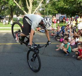 | Keywords: Mountain bike cyclist Chris Clark demonstrates a maneuver.jpg en Chris Clark is a professional mountain bike rider who can balance his bike using brakes and balance 2012-08-07 own Tomwsulcer cc-zero Consent Uploaded with UploadWizard Stunt bike Summit New Jersey Cycling in New Jersey |