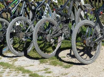 Keywords: mountain bikes wheels mature tire studs mountain bike tour circuit rear derailleur park rest break parked