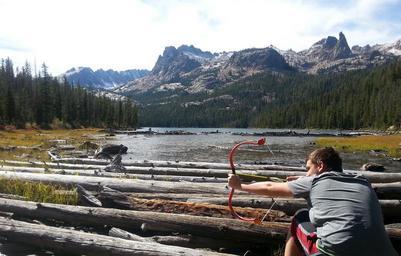 Keywords: mountain bow arrow archery goofing around boy lake