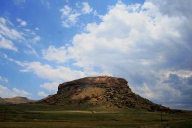 Keywords: mountain butte rocky flat top sun light green slopes veld blue sky clouds white
