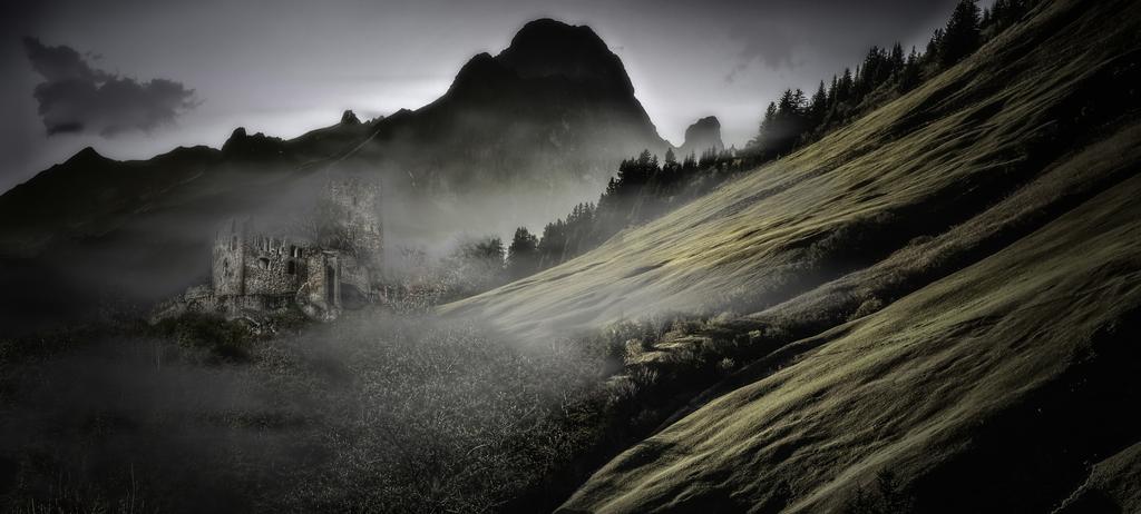Keywords: mountain fog dawn nature mist evening clouds castle building scene digital composing digital manipulation scenic
