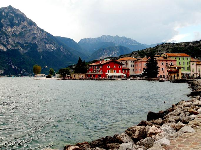 Keywords: mountain nature landscape water lake garda italy homes beach port rock bank outlook sea bay