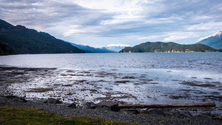 Keywords: mountain snow trees scenic nature landscape vista clouds pine trees wilderness lake water