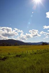 Keywords: mountain sun flare clouds field fence sky landscape nature outdoor summer scenery