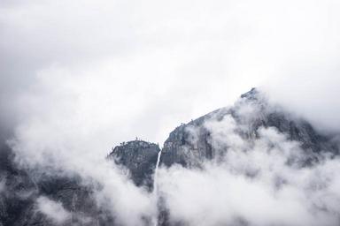 Keywords: mountain waterfall clouds stream abyss steep vertical wall rock landscape water nature outdoor weather fresh flowing wild splash view drop