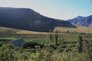 Keywords: mountains blue shadow valley green fields tall trees dense growth rooftop sky