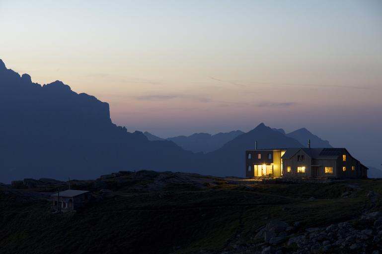 Keywords: mountains evening hut lighting hut evening mountain hut