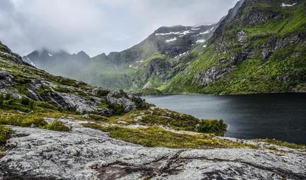 Keywords: mountains landscape nature sky travel blue peak rock hiking mountain landscape outdoor scenery grass clouds green water lake