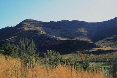 Keywords: mountains light and shadow folds slopes trees grass veld green yellow ochre sky