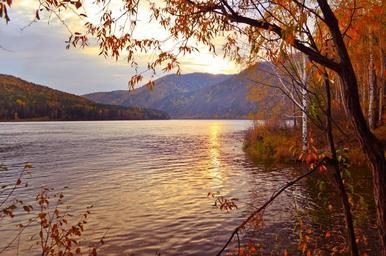 Keywords: mountains sunset evening trees forest river autumn september sun clouds
