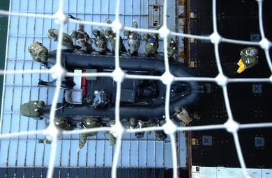 | Keywords: Moving a combat rubber raiding craft F-580 (CRRC) DVIDS14859.jpg en PACIFIC OCEAN January 19 2006 - Personnel attached to the US Naval Special Clearance Team One NSCT-1 carry a combat rubber raiding craft F-580 CRRC from the well deck to the stern gate moments before launching off the USS Comstock LSD 45 and into the water Working from the USS Comstock NSCT-1 is conducting deep/shallow water mine counter measure operations as they go through their annual training exercise U S Navy photo by Photographer's Mate 3rd Class Marcos T Hernandez 2006-01-19 https //www dvidshub net/image/14859 14859 2006-01-29 13 35 USS COMSTOCK LSD 45 USNORTHCOM AT SEA PD-USGov USS Comstock LSD-45 Images from DoD uploaded by Fæ |