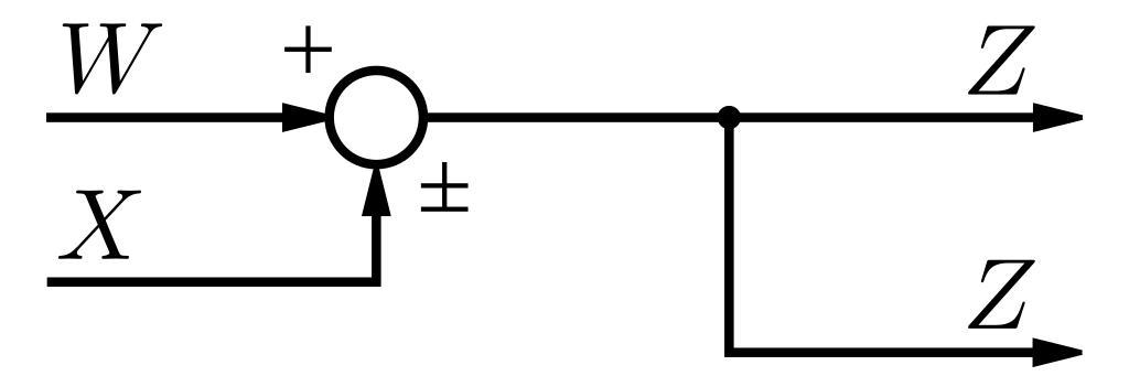 Keywords: Moving Takeoff Point ahead of a Summing Junction 1.svg control theory sense showing a combination of summing junctions implementing <math>Y X \pm Y</math> Own Inductiveload 2009-03-10 Control theory