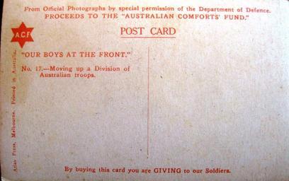 Keywords: ww1 australia vintage postcard military army patriotic australian comforts fund australiancomfortsfund text writing Moving up a division of Australia troops - WW1 - reverse Explore Aussie~mobs' 9093 photos on Flickr!