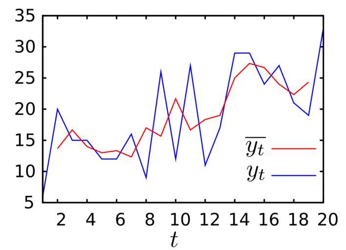 | Keywords: Movingaverage3.svg Moving averages of a discrete process with white noise <math>e_t \in \ 1 20\ </math> and drift 1 ;j602-source <nowiki> A ~ +/ B 20 20 + i 20 3 A\ B </nowiki> ;Maxima-Source <nowiki> plot2d 'discrete 1 2 3 4 5 6 7 8 9 10 11 12 13 14 15 16 17 18 19 20 6 20 15 15 12 12 16 9 26 12 27 11 17 29 29 24 27 21 19 33 'discrete 2 3 4 5 6 7 8 9 10 11 12 13 14 15 16 17 18 19 13 6667 16 6667 14 13 13 3333 12 3333 17 15 6667 21 6667 16 6667 18 3333 19 25 27 3333 26 6667 24 22 3333 24 3333 x 1 20 plot_format gnuplot gnuplot_term ps gnuplot_ps_term_command set size 0 9 0 9; set term postscript eps color solid lw 2 5 30 gnuplot_out_file plot2d eps </nowiki> Retouched with inkscape Digital signal processing Moving averages |