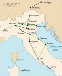 | Keywords: Mozart in Italy sr.svg en Map showing main centres visited during first Italian journey December 1769 to March 1771 The black line shows the main outward route from Salzburg to Naples The green line marks detours taken during the return journey Mozart_in_Italy svg 2010-09-06 14 27 UTC Mozart_in_Italy svg Self-made by Jappalang derivative work Ivan25 tranlsation in Serbian Ivan25 Mozart_in_Italy svg SVG maps of Italy Wolfgang Amadeus Mozart SVG maps in Serbian | ||||