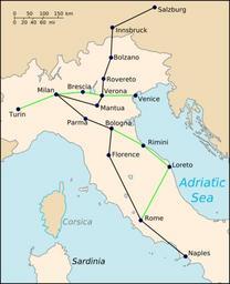 | Keywords: Mozart in Italy.svg en Map showing main centres visited during first Italian journey December 1769 to March 1771 The black line shows the main outward route from Salzburg to Naples The green line marks detours taken during the return journey Base File Map of Italy-it svg by User F l a n k e r Data File MozartItalyMap2 jpg by User Brianboulton based on journey account in cite book Sadie Stanley 2006 Mozart The Early Years 1756-1781 W W Norton Co 0-393-06122-4 Self-made by Jappalang 2009-01-17 Mozart in Italy de svg Mozart in Italy sr svg File MozartItalyMap2 jpg SVG maps of Italy Wolfgang Amadeus Mozart |