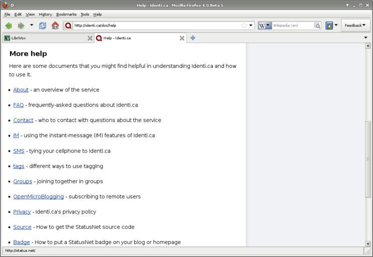Keywords: Mozilla Firefox 4.0b1 en-US on Debian with Xfce4 at 1024x768.png Screenshot of Mozilla Firefox 4 0 Beta 1 for Linux running on Debian GNU/Linux with Xfce 4 at 1024x768 It is displaying an Identi ca help page The left tab has LibriVox loaded Ekrankopio de lang en Mozilla Firefox versio 4 0 Beta 1 por Linukso funkcianta sur Debian GNU/Linux kun Xfce 4 je 1024x768 Ä i estas montranta helpopaÄ on de la StatusNeta Identi ca En la maldekstra folio Å argitas LibriVox own <br/> Screenshot 2010-07-07 Mozilla Firefox ”2010 Icons some from the Tango project public domain Identi ca help <br/> Ekrankopio 2010-07-07 Mozilla Firefox ”2010 Bildsimboloj some from the Tango project public domain HelpopaÄ o de Identi ca <br/> Screenshot AVRS Mozilla Firefox Contributors LibriVox icon Identi ca help <br/> Ekrankopio AVRS Mozilla Firefox Mozilo kaj kontribuantoj Bildsimbolo de LibriVox HelpopaÄ o de Identi ca <gallery> File Mozilla Firefox 4 0b1 en-US on Debian with Xfce4 smaller png LangSwitch A smaller window Malpligranda fenestro </gallery> trademarked Firefox The logo http //www mozilla org/foundation/trademarks/ is a trademark La emblemo http //www mozilla org/foundation/trademarks/ estas varmarko MTL trademarked Identi ca cc-by-3 0 LibriVox LibriVox public domain Screenshots of Mozilla Firefox 4 x Screenshots with English Identi ca Location not applicable Files by User AVRS/Screenshots/Web |