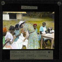 | Keywords: "Mrs Arnott and Girls at Slessor Memorial Home, Arochuku", Calabar (imp-cswc-GB-237-CSWC47-LS2-055).jpg en <br> Mrs Arnott Girls at Slessor Memorial Home Arochuku Calabar 5 girls during a sewing lesson outside the Mary Slessor Home for Women and Girls at Arochuku The centre was established in memory of Mary Slessor the Scottish Missionary Photographer Unknown Subject personal name Slessor Mary Mitchell 1848-1915 Filename imp-cswc-GB-237-CSWC47-LS2-055 tif Coverage date after 1915 Part of collection International Mission Photography Archive ca 1860-ca 1960 Type images Part of subcollection Photographs from the Centre for the Study of World Christianity University of Edinburgh U K ca 1900-ca 1940s Repository name Centre for the Study of World Christianity Archival file impaunpub_Volume7/1329 url Repository address The University of Edinburgh School of Divinity New College Mound Place Edinburgh EH1 2LX United Kingdom Geographic subject country Nigeria Format aacr2 1 lantern slide 8 x 8 cm Geographic subject continent Africa Rights Contact the repository for details Part of series Mary Slessor LS2 Repository email divinity-CSWC ed ac uk Subject lcsh Keyword Memorials; Religious education; Women Education Date created after 1915 Publisher of the digital version University of Southern California Libraries Subject aat genre group portrait Format aat lantern slides Legacy record ID impa-m68200 Access conditions http //www ed ac uk/schools-departments/divinity/research/centres/world-christianity/collections-resources File GB 237 CSWC47/LS2/55 after 1915 author http //digitallibrary usc edu/cdm/ref/collection/p15799coll123/id/64451 PD-old-70-1923 Magic lantern images Images from USC Digital Library uploaded by Fæ International Mission Photography Archive ca 1860-ca 1960 Calabar Sewing |