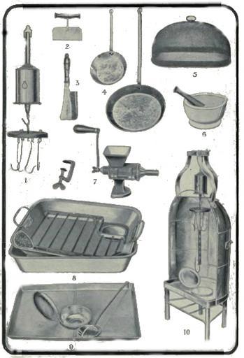 Keywords: Mrs. Beeton's Book of Household Management (93).jpg en This is the image displayed on page 93 in Mrs Beeton's Book of Household Management by Isabella Beeton The image depicts a variety of common kitchen utensils Bottle Roasting Jack Mincing Knife or Suet Chopper Meat Chopper Frying Pans Wire Meat Cover Pestle and Mortar Mincing or Sausage Machine with Table Clamp Double Baking Pan with Meat Stand Drip Pan with Basting Ladle Bottle Jack Roasting Screen 2012-08-05 Printed in 1907 version File Mrs Beeton's Book of Household Management Part 1 djvu Isabella Beeton PD-old-100 Uploaded with UploadWizard Mrs Beeton's Book of Household Management Kitchen utensils |