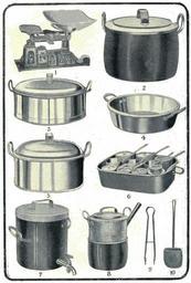 | Keywords: Mrs. Beeton's Book of Household Management (94).jpg en This is the image displayed on page 94 in Mrs Beeton's Book of Household Management by Isabella Beeton The image depicts a variety of common kitchen utensils Household Weighing Machine Oval Boiling Pot Turbot Kettle Copper Preserving Pan Fish Kettle Bain-Marie Pans Iron Stockpot with Tap Saucepan and Steamer Steak Tongs Fish Slice Printed in 1907 version File Mrs Beeton's Book of Household Management Part 1 djvu Isabella Beeton PD-old-100 Uploaded with UploadWizard Mrs Beeton's Book of Household Management Kitchen utensils |