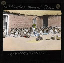 | Keywords: "Mrs Elmslie and Women's Class, Livingstonia" Malawi, ca.1895 (imp-cswc-GB-237-CSWC47-LS3-1-034).jpg en <br> Mrs Elmslie and Women's Class Livingstonia Malawi ca 1895 Photograph of a group of African women seated outside a red brick building Mrs Elmslie can be seen standing behind the group and in the foreground of the picture are a number of pots These possibly contain food for a class teaching domestic skills The houses in the town of Livingstonia are mostly constructed with red bricks ; Walter Angus Elmslie 1856-1935 was the author of Among the wild Ngoni some chapters in the history of the Livingstonia mission in British Central Africa New York 1899 Photographer Unknown Filename imp-cswc-GB-237-CSWC47-LS3-1-034 tif Coverage date circa 1895 Part of collection International Mission Photography Archive ca 1860-ca 1960 Type images Part of subcollection Photographs from the Centre for the Study of World Christianity University of Edinburgh U K ca 1900-ca 1940s Repository name Centre for the Study of World Christianity Archival file impaunpub_Volume7/1420 url Repository address The University of Edinburgh School of Divinity New College Mound Place Edinburgh EH1 2LX United Kingdom Geographic subject country Malawi Format aacr2 1 lantern slide 8 x 8 cm Geographic subject continent Africa Rights Contact the repository for details Part of series Elmslie of the Wild Ngoni LS3/1 Repository email divinity-CSWC ed ac uk Subject lcsh Keyword Women Education Date created circa 1895 Publisher of the digital version University of Southern California Libraries Subject aat genre group portraits Format aat lantern slides Legacy record ID impa-m68430 Access conditions http //www ed ac uk/schools-departments/divinity/research/centres/world-christianity/collections-resources File GB 237 CSWC47/LS3/1/34 1895 author http //digitallibrary usc edu/cdm/ref/collection/p15799coll123/id/64541 PD-old-70-1923 Magic lantern images Images from USC Digital Library uploaded by Fæ International Mission Photography Archive ca 1860-ca 1960 |
