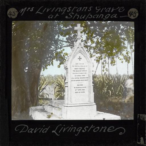 | Keywords: Mrs Livingstone's Grave at Shupanga, ca.1862 (imp-cswc-GB-237-CSWC47-LS16-045).jpg en <br> Mrs Livingstone's Grave at Shupanga ca 1862 Photograph of the grave of Mary Moffat 1821-1862 the wife of David Livingstone the Scottish missionary and explorer She is buried at Shupanga on the Zambezi The head stone reads Here repose the mortal remains of Mary Moffat the beloved wife of Doctor Livingstone In humble hope of a resurrection by our saviour Jesus Christ She died in Shupanga House 27th April 1862 aged 41 years ; This belongs to a series of Church of Scotland Foreign Missions Committee lantern slides relating to David Livingstone 1813-1873 the Scottish missionary who was best known as an explorer of Africa and anti-slavery campaigner Livingstone was born in Blantyre Scotland and after working in the local cotton mill from the age of 10 he went on to study medicine and theology in Glasgow in 1836 Having decided to become a missionary he was posted to southern Africa in 1841 In 1845 he married Mary Moffat During his life Livingstone carried out exploration of southern eastern and central Africa he discovered and named the Victoria Falls and it was his meeting with H M Stanley during a search for the source of the Nile that gave rise to the popular quotation Dr Livingstone I presume David Livingstone died in Africa on 1 May 1873 and his body was buried in Westminster Abbey Photographer Unknown Subject personal name Livingstone David 1813-1873 Filename imp-cswc-GB-237-CSWC47-LS16-045 tif Coverage date circa 1845/1860 Part of collection International Mission Photography Archive ca 1860-ca 1960 Type images Part of subcollection Photographs from the Centre for the Study of World Christianity University of Edinburgh U K ca 1900-ca 1940s Repository name Centre for the Study of World Christianity Archival file impaunpub_Volume7/1878 url Repository address The University of Edinburgh School of Divinity New College Mound Place Edinburgh EH1 2LX United Kingdom Geographic subject country Zambia Format aacr2 1 lantern slide 8 x 8 cm Geographic subject continent Africa Rights Contact the repository for details Part of series David Livingstone LS16 Repository email divinity-CSWC ed ac uk Subject lcsh Keyword Memorials Date created circa 1875/1940 Publisher of the digital version University of Southern California Libraries Subject aat genre close up views Format aat lantern slides Legacy record ID impa-m69458 Access conditions http //www ed ac uk/schools-departments/divinity/research/centres/world-christianity/collections-resources File GB 237 CSWC47/LS16/45 circa 1875 /1940 date created author http //digitallibrary usc edu/cdm/ref/collection/p15799coll123/id/64994 PD-old-70-1923 Magic lantern images Images from USC Digital Library uploaded by Fæ International Mission Photography Archive ca 1860-ca 1960 David Livingstone IMPA |