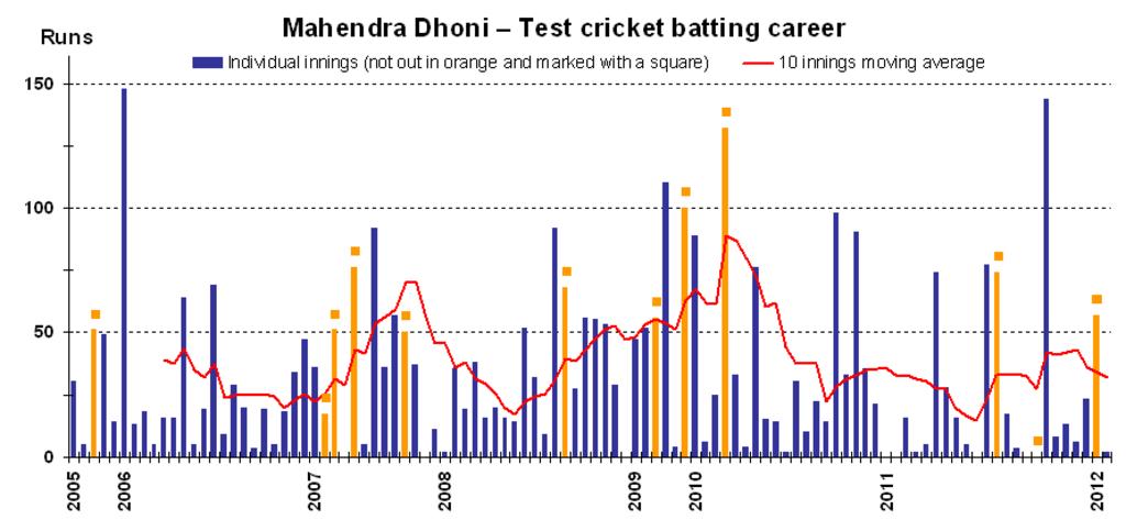 | Keywords: MS Dhoni test batting career v2.png This graph details the test match performance of cricketer Mahendra Dhoni and was created by en wiki w user EdChem Each bar indicates a single test match innings blue ones for innings in which he was dismissed orange ones for innings in which he batted but was not out The red line shows a 10 innings moving average as at the end of each innings An alternative version w File MS Dhoni test batting career v1 png instead shows the cumulative career batting average <p>The graph was generated with Microsoft Excel 2003 the resulting chart being copied to Adobe Photoshop 9 and saved in png format using data from w Cricinfo http //stats espncricinfo com/stats/engine/player/28081 html class 1;template results;type batting;view innings and w Howstat http //www howstat com au/cricket/Statistics/Players/PlayerProgressBat asp PlayerID 3243 This version is current as at the end of the Australia-India test in Sydney in January 2012 It was prepared on 11 January 2012 en wikipedia FastilyClone MTC EdChem w other versions Convert to SVG graph EdChem wikipedia en Cc-zero Original upload log page en wikipedia MS+Dhoni+test+batting+career+v2 png wikitable - 2012-01-11 11 33 51 889× 411× EdChem correcting error - 10 innings moving average not 10 match moving average - 2012-01-11 11 26 55 889× 411× EdChem This graph details the test match performance of cricketer Mahendra Dhoni and was created by en wiki user EdChem Each bar indicates a single test match innings blue ones for innings in which he was dismissed - Uncategorized 2016 July 24 |