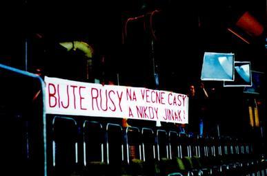 | Keywords: Ms hokej 1983a.jpg en During the 1983 hockey world championships in Munich Germany Czech emigrants are showing a transparent protesting against the Russian occupation of their country since the suppression of the Prague Spring de Tschechische Emigranten zeigen beim Spiel der Tschechoslowakei gegen die Sowjetunion bei der 1983er Eishockey-Weltmeisterschaft in München ein Transparent mit dem sie gegen die Besetzung ihres Landes durch sowjetische Truppen seit der Niederschlagung des Prager Frühlings protestieren Antonín Tichov Antonín Tichov 1983-04-30 Ms_hokej_1983b jpg 1983 IIHF World Championship Photographs taken on 1983-04-30 Ice hockey supporters |