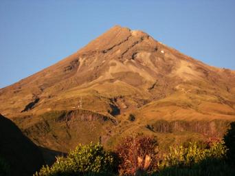 Keywords: Mt. Taranaki from Maketawa Hut.jpg Mt Taranaki in the morning sun from Maketawa Hut<br>Behind the Translator Radio Antenna the Tahurangi Lodge 2013-03-21 own Sarang Maketawa Hut Tahurangi Lodge