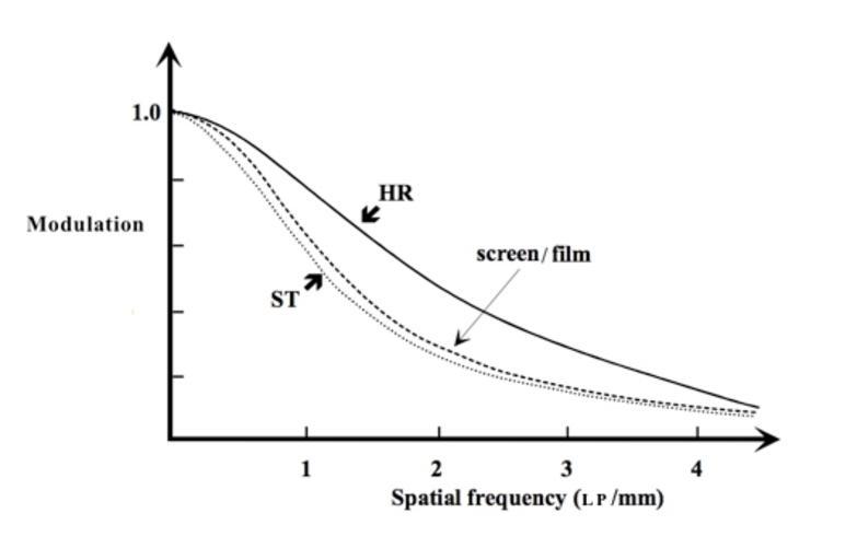 | Keywords: MtfCR.jpg en MTFs for phosphor plates used in CR Curves are for high resolution HR and standard ST plates The MTF for a commonly used film-screen combination is also shown for comparative purposes own Kieranmaher 2001-01-01 Reproduced with permission from Heggie JCP Liddell NA Maher KP 2001 Applied Imaging Technology 4th Edition Physics diagrams |