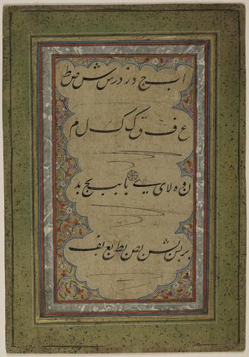 | Keywords: Mufradat Page WDL6830.png Artwork ru Ст аница с алфавитными каллиг афическими уп ажнениями fr Page de mudrafat en Mufradat Page zh 字母书法练习 pt Página de mufradat ar صفحة مفردات ru Данный ф агмент соде жит пе вую ст аницу одного из альбомов с алфавитными <em>муф адат</em> каллиг афическими уп ажнениями Подобные альбомы включают <em> аль-ху уф аль-муф адах </em> или в соответствии с османской т адицией <em> ху уф-и мукатта'а </em> одиночные буквы а абского алфавита в последовательном по ядке за кото ыми следуют буквы в сочетаниях согласно ту ецкой т адиции <em> му еккебе </em> буквально па ы Книги уп ажнений по каллиг афии появились не позднее XVII века в османской Ту ции и п именялись на п отяжении значительной части XX века Они использовались как об азцы каллиг афии на п име е кото ых учащиеся знакомились с а абским алфавитом и учились чистописанию К оме того они от ажают изменения п оисходившие в области каллиг афии на п отяжении столетий Пе вые т и ст оки данного листа соде жат одиночные буквы в алфавитном по ядке В се едине т етьей ст оки находится озетка светло-голубого цвета с золотым пункти ом служащая для отделения отдельно стоящих букв в ве хней части листа от последовательности буквенных сочетаний в нижней части Сочетания букв состоят из вто ой буквы алфавита <em> ба </em> б с последующими буквами алфавита ежду ст оками текста че ными че нилами на исованы изогнутые волнистые линии п изванные заполнить свободное п ост анство кото ое иначе оказалось бы пустым Буквы написаны че ными че нилами на бумаге бежевого цвета ш ифтом насталик и ок ужены полосами в фо ме облаков на исованными светло-голубыми и че ными че нилами ежду этими полосами и п ямоугольной амкой находятся несколько цветочных о наментов нанесенных на золотой фон испещ енный т ехточечными насечками Работа заключена в се ию п остых цветных амок между кото ыми находится полоса бумаги с бело-се ым м амо ным исунком Рамки и м амо ная бумага наклеены на лист более плотной светло-зеленой бумаги с золотыми к апинками <br>А абская каллиг афия; А абские укописи; Иллюмини ование укописей fr Ce fragment contient ce qui aurait été la première page d'un album d'exercices calligraphiques <em>mufradat</em> alphabétiques De tels albums comprennent en séquence <em>al-huruf al-mufradah</em> ou dans la tradition ottomane <em>huruf-i muqatta'a</em> les lettres individuelles de l'alphabet arabe suivies par les lettres dans leur forme composée dans la tradition turque <em>murekkebe</em> littéralement « paires » Les livres d'exercice apparurent au plus tard au XVII<sup>e</sup> siècle en Turquie ottomane et se sont poursuivis jusqu'au XX<sup>e</sup> siècle Ils étaient utilisés comme livres de modèles de calligraphie pour présenter aux étudiants l'alphabet arabe et la pratique d'une belle écriture Ils sont aussi les témoins d'une chaine de transmission de la connaissance en calligraphie à travers les siècles Les trois premières lignes de ce feuillet comprennent les lettres individuelles en ordre alphabétique Au milieu de la troisième ligne apparait une rosette pointillée bleu clair et or destinée à séparer les lettres isolées du haut de la séquence de lettres composées du bas Les lettres composées combinent la seconde lettre de l'alphabet <em>ba</em> b aux lettres suivantes de l'alphabet Entre les lignes de texte apparaissent des lignes courbes ondulées à l'encre noire destinées à remplir les espaces vides autrement non ornés de la composition Les lettres sont en écriture nastaliq noire sur un papier beige et entourées de bandes de nuages à l'encre bleu clair et blanche Entre les bandes et le cadre rectangulaire apparaissent des motifs floraux enluminés sur fond doré pointillé d'incisions en trois points Les cadres de l'œuvre combinent des couleurs uniques avec un papier interne marbré blanc et gris Le papier et les cadres sont placés sur un papier plus épais vert clair décoré de mouchetures dorées <br>Calligraphie arabe; Manuscrits arabes; Enluminures en This fragment contains what would have been the first page of an album of calligraphic <em>mufradat</em> alphabetical exercises Such albums include <em>al-huruf al-mufradah</em> or in the Ottoman tradition <em>huruf-i muqatta'a</em> the single letters of the Arabic alphabet in sequence followed by letters in their composite form in the Turkish tradition <em>murekkebe</em> literally p