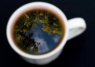 Keywords: mug cup teacup tea reflection sky forest macro closeup nature